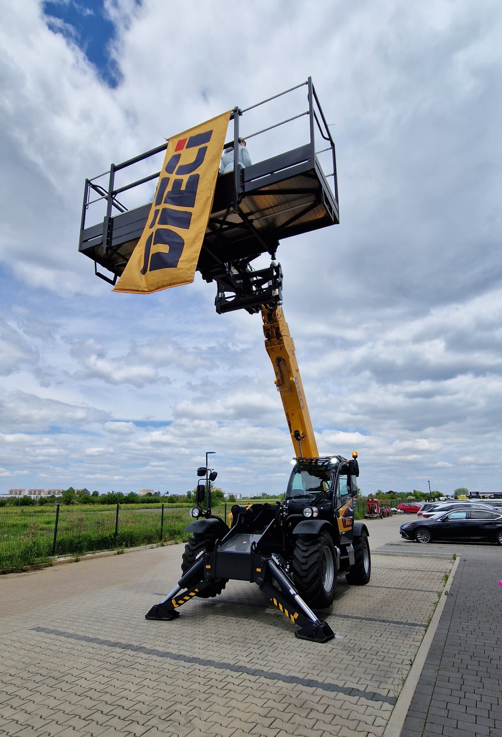 | • Axles with 45% differential lock mechanism • 400/70-24 Michelin wheels • Semi-automatic air conditioning • Pneumatic seat • Reversing camera + TFT 7″ • LED work lighting (cab + boom) • DTS telematics (36 months) • Carriage + forks 120 × 50 × 1,200 mm (5 t) • Rotating basket for lifting people 120 x 240 cm hydraulically extendable to 420 cm, lifting capacity 800 kg • Dieci quick coupler with hydraulic socket |