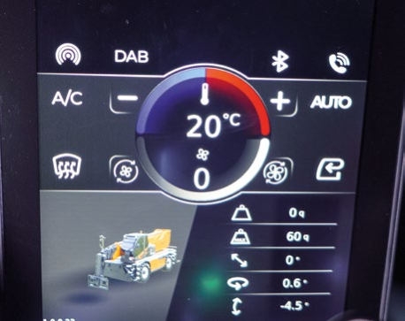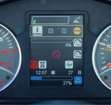 | Oprzyrządowanie kabiny | Podwójny kolorowy monitor TFT 3,5″ + TFT 7″ ze wskaźnikiem obciążenia i diagnostyką funkcji, licznik obrotów, termometr wody, wskaźnik poziomu paliwa, kontrolka temperatury wody i oleju silnikowego, tachometr, licznik godzin, zegar, wskaźnik poziomu AdBlue, system automatycznego rozpoznawania wyposażenia |